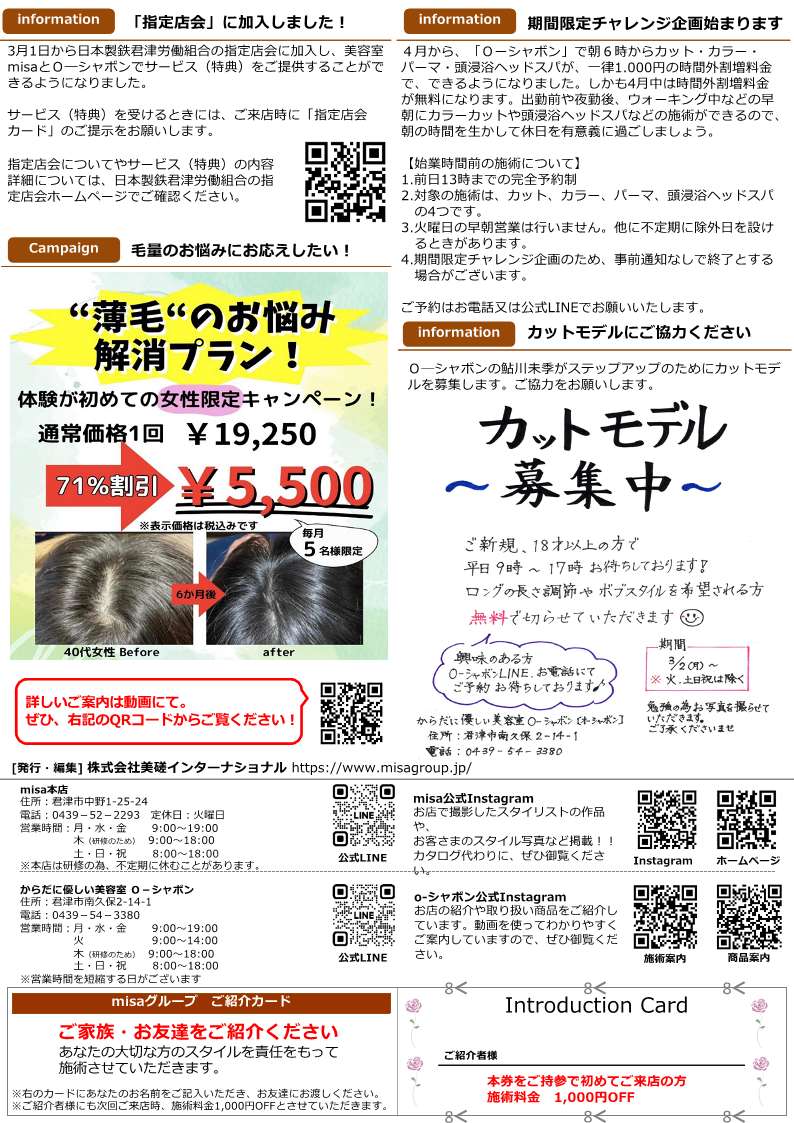 4月から「O-シャボン」で朝6時からカット・カラー・パーマ・頭浸浴ヘッドスパが、一律1,000円の時間外割増料金で、できるようになりました。